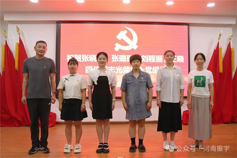 为四名预备党员佩戴党徽,祝贺四名同志光荣加入党组织!
