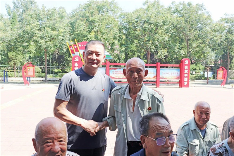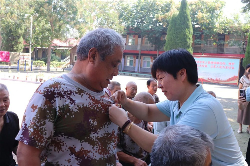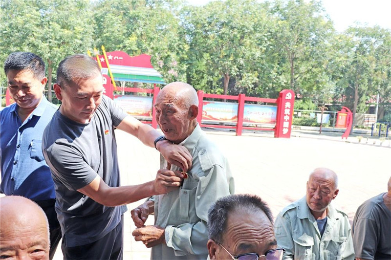 怀着敬仰的心情,大家为抗美援朝老兵刘锁子、对越自卫反击战老兵王英林等抗战老兵们佩戴毛主席像章。老兵们纷纷致谢,每个人的脸上都洋溢着喜悦的笑容。