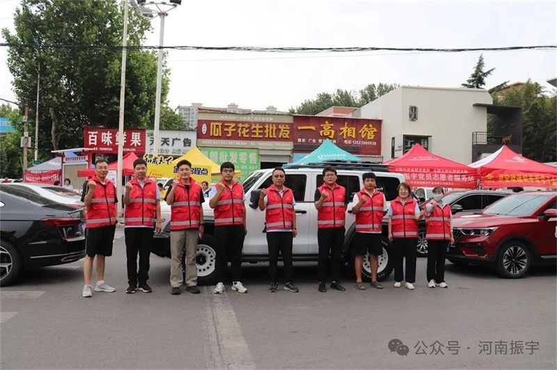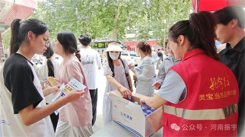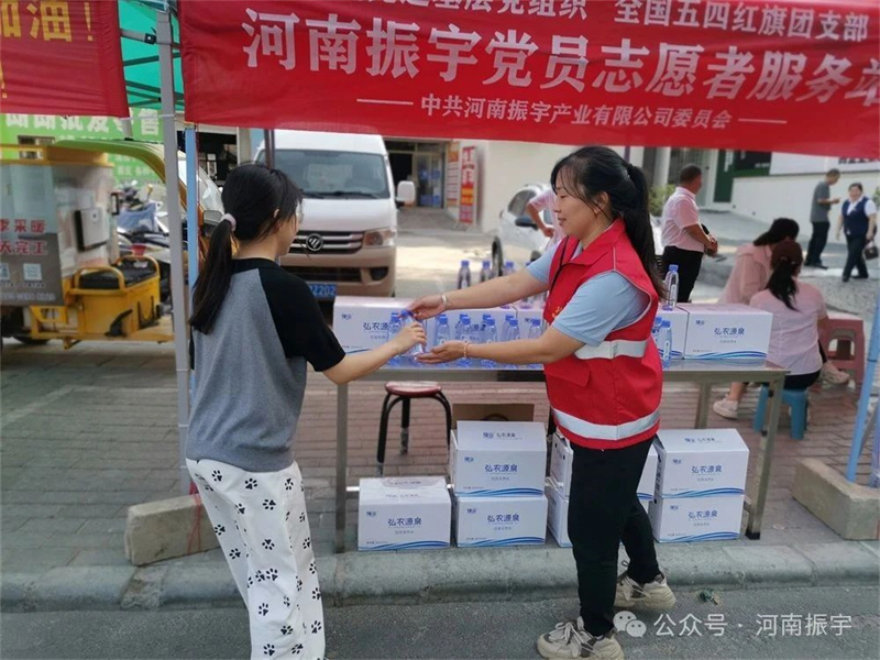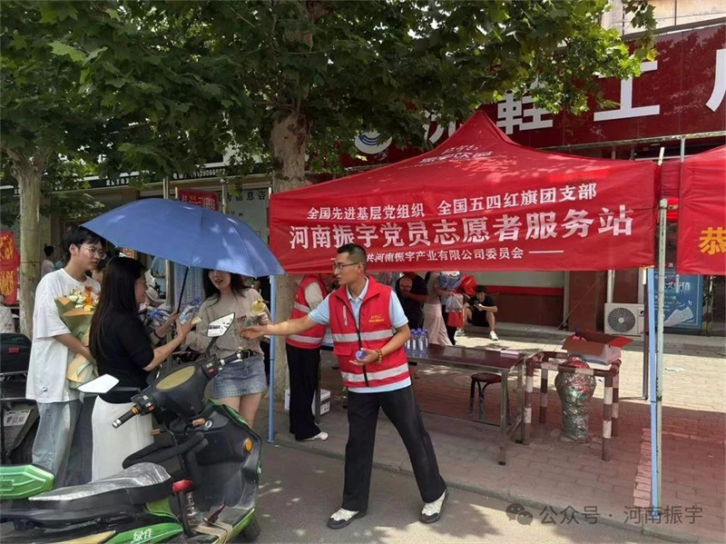 在各个考点外,我们设立了河南振宇党员志愿者服务站和纯净水供应点。志愿者们身着红马甲,顶着高温,为广大考生发放饮用水,用清凉和微笑帮助驱散考试紧张氛围。