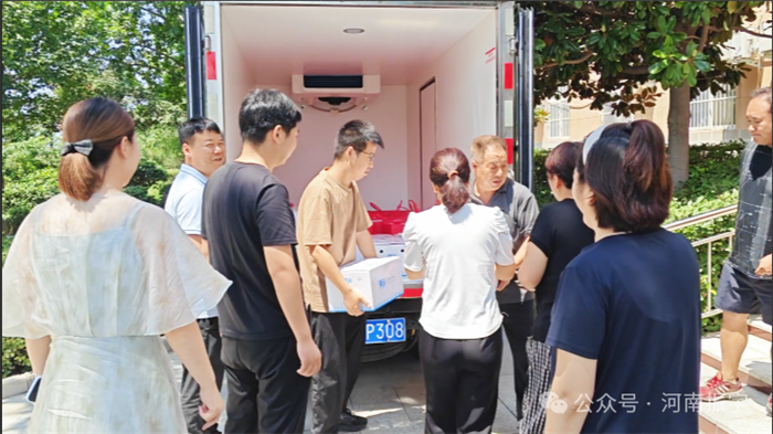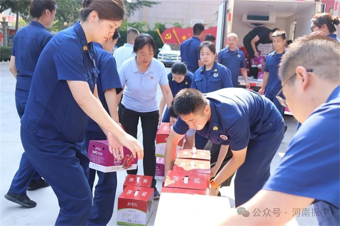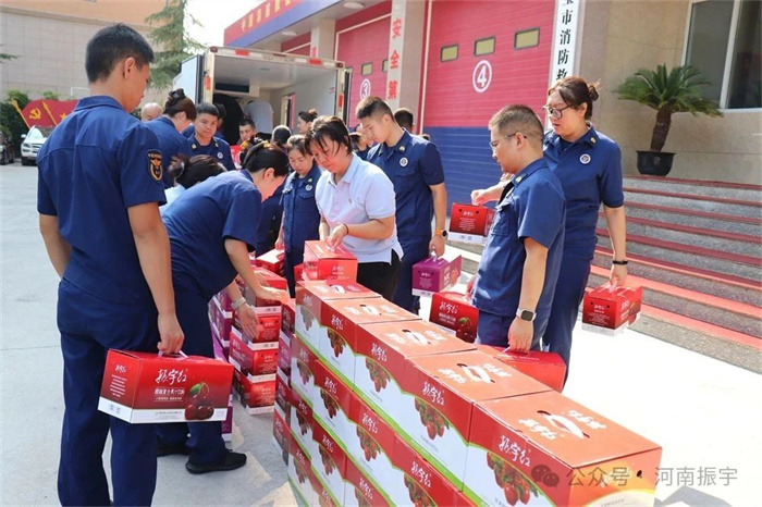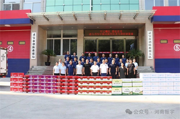 在灵宝市消防救援大队,振宇党员志愿者向消防指战员们送上了振宇红系列饮品等清凉物资,向可敬的“火焰蓝”表达深切的感谢与诚挚的敬意!