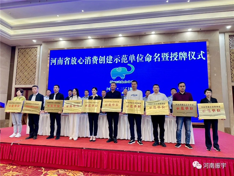 河南振宇产业有限公司被评为“河南省放心消费创建示范单位”。河南振宇党委书记、董事长宋振廷参加命名暨授牌仪式。