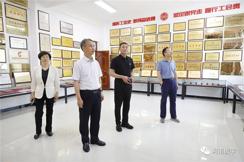 参观中国工运史文献展览室、公司发展历程展览馆,领导们观看了工运史版面、文献、书籍、证件、徽章等藏品,以及公司获得的多项党建荣誉,并了解河南振宇坚持党建引领,历经27年艰苦创业、诚信经营、创新发展的历程。