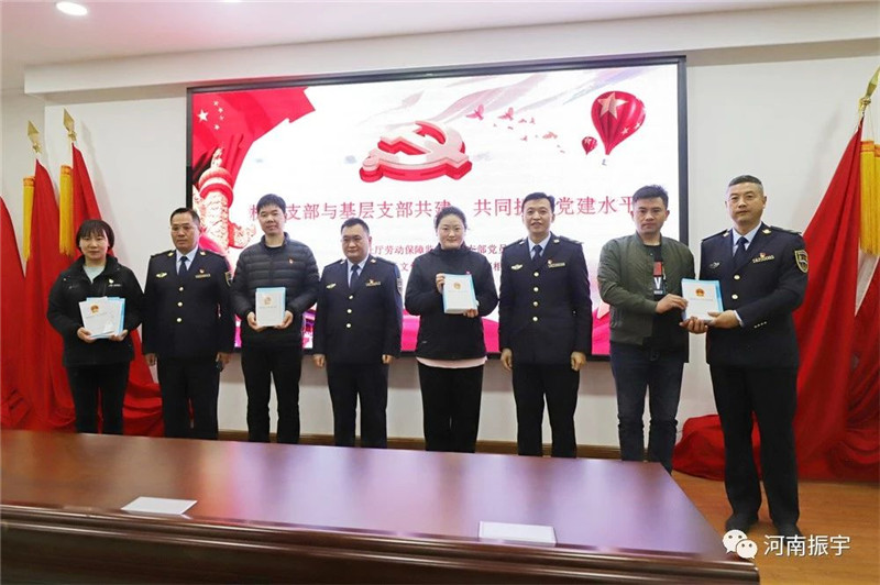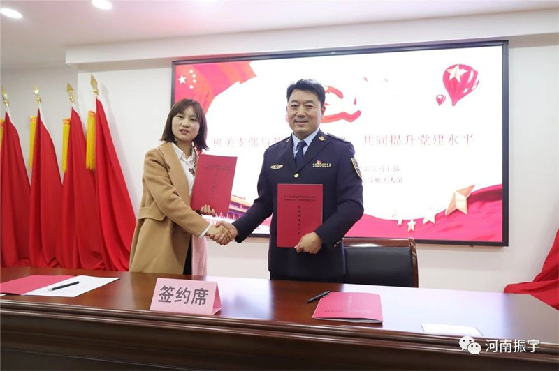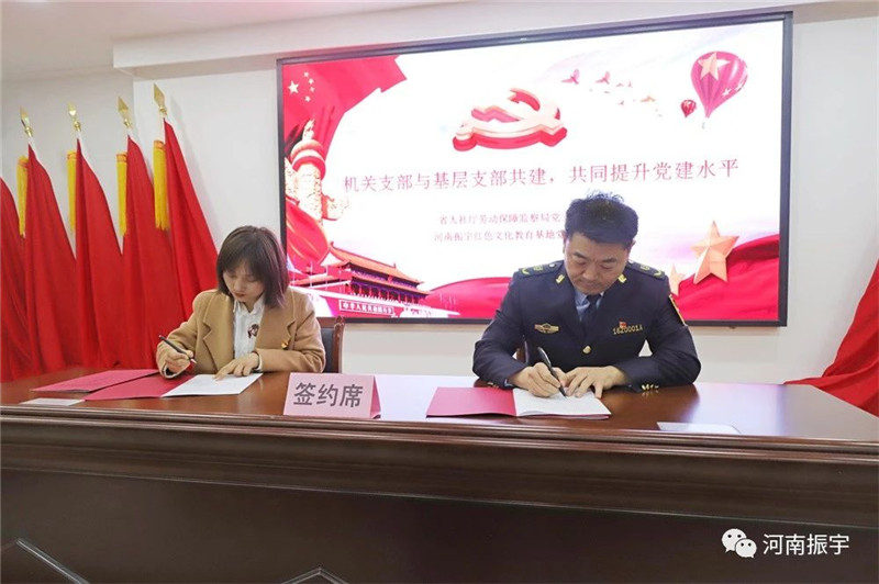 省人社厅劳动保障监察局局长李宏灿、河南振宇红色文化教育基地党支部书记吴静共同签署支部共建协议书。