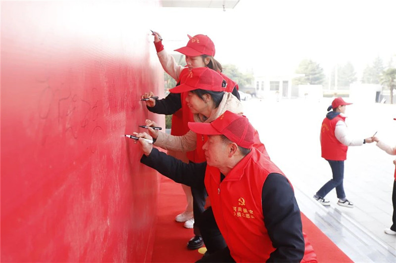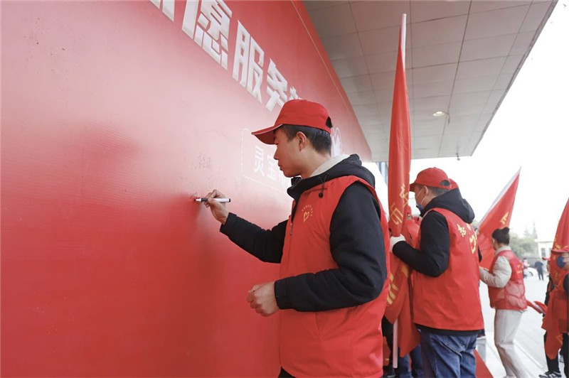 参会领导和志愿者在活动墙上郑重签名,以此表明矢志践行志愿精神、弘扬文明新风。