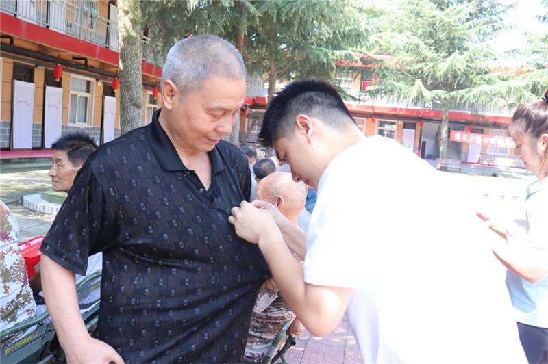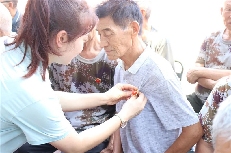 怀着敬仰的心情,大家为抗美援朝老兵刘锁子、对越自卫反击战老兵王英林等抗战老兵们佩戴毛主席像章。老兵们纷纷致谢,每个人的脸上都洋溢着喜悦的笑容。