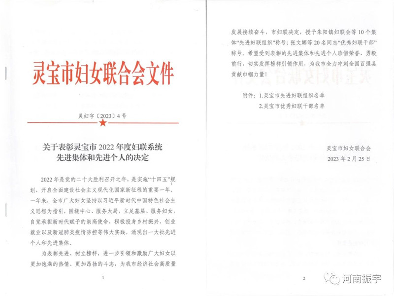 河南振宇产业有限公司妇委会荣获“灵宝市先进妇联组织”,振宇党委委员、妇委会副主席李泽会荣获2022年度“灵宝市优秀妇联干部”荣誉称号!